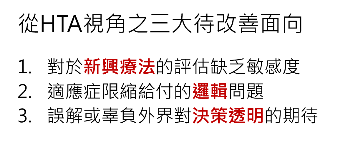 輔仁大學數據科學中心蒲若芳執行長首先從醫療科技評估角度指出,目前制度存在三大問題,包括對新興治療方法敏感度不足、適應症限縮邏輯不一致,以及審查決策透明度不足,且進一步說明:「醫療科技評估(Health Technology Assessment, HTA)的核心不是限制給付,而是確保決策邏輯與證據基礎的一致性」。若決策已選擇限縮適應症,即代表已隱含認可該族群之臨床效益;不宜再對同一族群反覆提高或追加證據要求,否則實質上將形成以證據名義進行給付限縮的情形,並建議參考英國NICE制度,台灣應積極規劃導入「範疇界定(scoping)」與早期預警機制,並強化病人與專家參與,以提升決策品質與透明度。