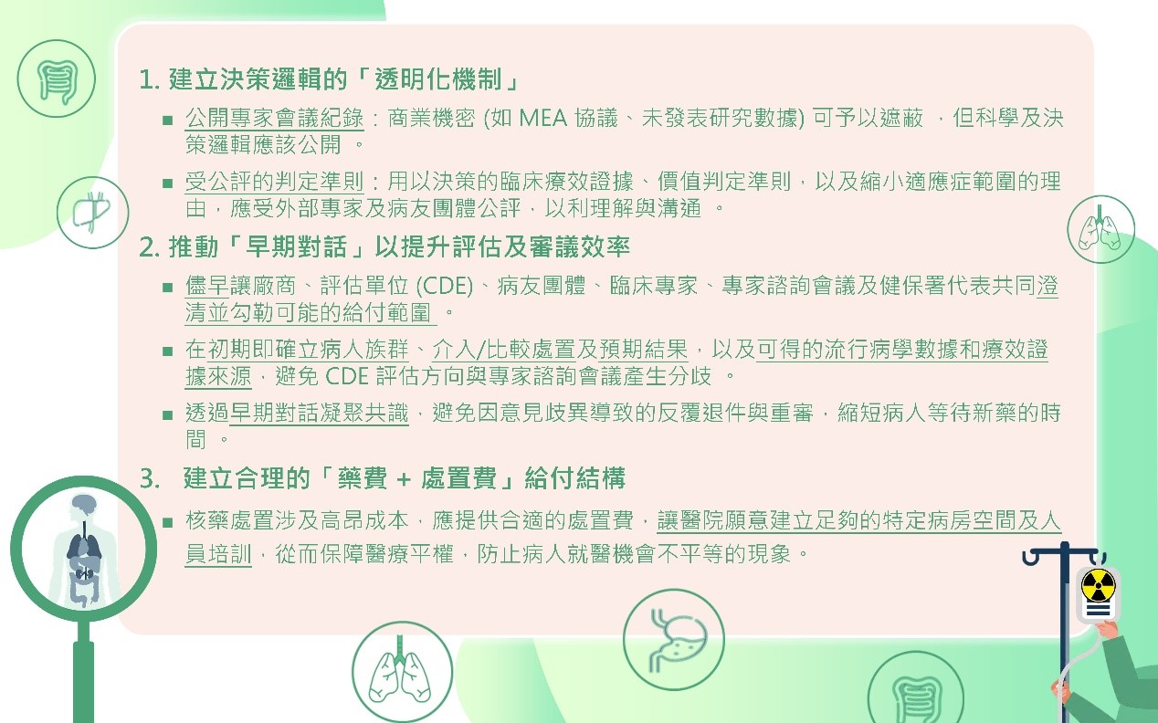健康效果暨醫療科技教育聯盟楊雯雯秘書長,特別強調現行適應症限縮與給付範圍調整缺乏清楚地決策說明,容易造成各界認知落差與反覆審查。她強調,應建立「決策透明化機制」,適度公開專家會議紀錄與判定依據,並推動跨利害關係人的「早期對話」,讓主管機關、臨床專家、病友團體與產業在初期即凝聚評估審議共識,以提升評估效率、縮短新藥納入健保的時間。此外亦建議應建立合理的「藥費 + 處置費」給付結構,核藥處置涉及高昂成本,應提供合適的醫療服務處置費,讓醫院願意建立足夠的特定病房空間及人員培訓,從而保障醫療平權,防止病人就醫機會不平等的現象。